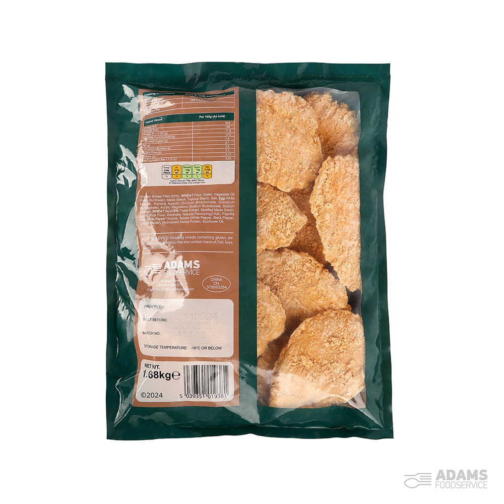 Chicken Breast Fillet (62%), WHEAT Flour, Water, Vegetable Oil (Palm, Sunflower), Maize Starch, Tapioca Starch, Salt, EGG White Powder, Raising Agents (Sodium Bicarbonate, Disodium Diphosphate), Acidity Regulator (Sodium Bicarbonate, Sodium Citrates), WHEAT GLUTEN, Yeast Extract, Modified Maize, Sugar, Rice Flour, Dextrose, Natural Flavouring (chili), Paprika red, White pepper ground, Spices (White Pepper, black pepper, onion powder), Hydrolysed Maize Protein, sunflower oil.