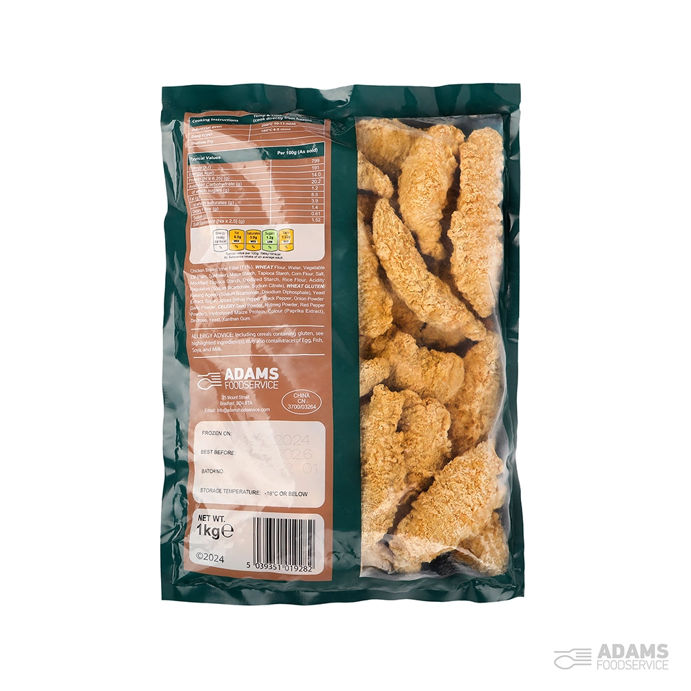 Chicken Breast Inner Fillet (71%), WHEAT Flour, Water, Vegetable Oil (Palm, Sunflower), Maize Starch, Tapioca Starch, Corn Flour, Salt, Modified Tapioca Starch, Oxidized Starch, Rice flour, Acidity Regulators (Sodium Bicarbonate, Sodium Citrate), WHEAT GLUTEN, Raising Agents (Sodium Bicarbonate, Disodium Diphosphate), Yeast Extract, Sugar, Spices (White Pepper, black pepper, onion powder, Garlic powder, CELERY seed powder, Nutmeg powder, Red pepper powder), Hydrolysed Maize Protein, Colour (Paprika Extract), Dextrose, Yeast, Xanthan Gum.