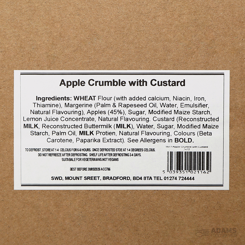 WHEAT Flour (with added calcium, Niacin, Iron, Thiamine), Margerine (Palm & Rapeseed Oil, Water, Emulsifier, Natural Flavouring), Apples (45%), Sugar, Modified Maize Starch, Lemon Juice Concentrate, Natural Flavouring. Custard (Reconstructed MILK, Reconstructed Buttermilk (MILK), Water, Sugar, Modified Maize Starch, Palm Oil, MILK Protien, Natural Flavouring, Colours (Beta Carotene, Paparika Extract)