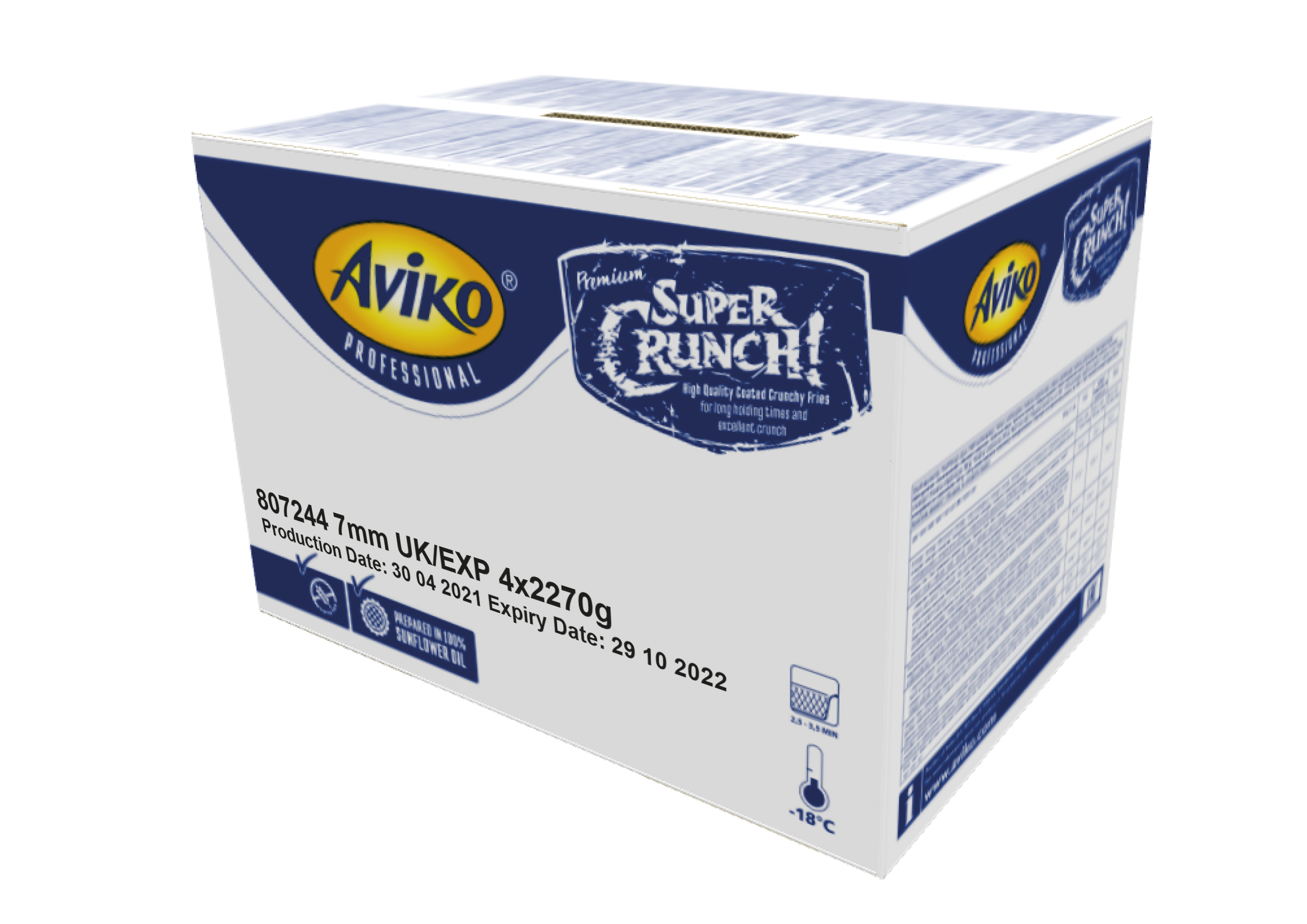 Using the highest quality potato varieties, which have a higher dry matter, keeps our fries crunchier for longer. Everyone can enjoy our delicious fries, as they are both gluten-free and suitable for vegetarians. The thicker Super Crunch coating ensures that our fries are piping hot and remain satisfyingly crunchy fitting perfectly into home delivery packaging without any breakage, loss of heat or loss of crunch. Super thin fries at 7.4mm.