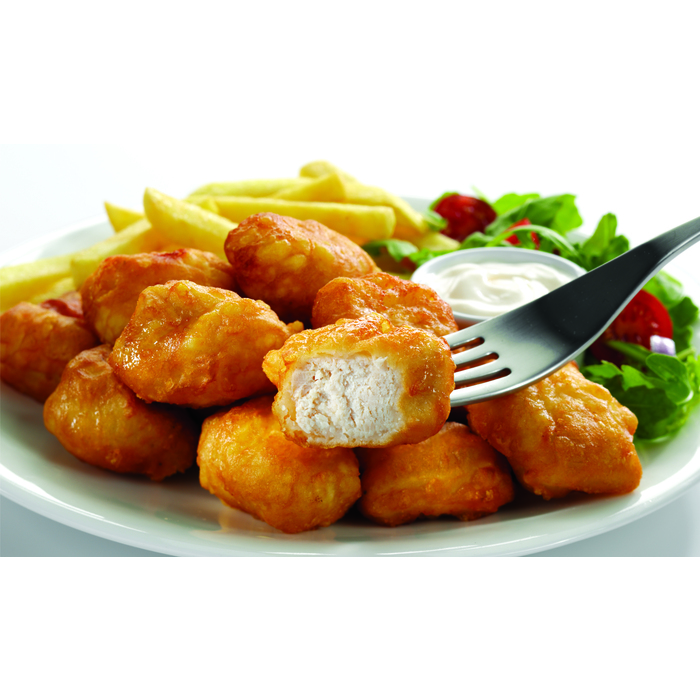 Chicken (54.5%), Water, WHEAT Flour, Maize Flour, WHEAT Semolina, Rapeseed Oil, WHEAT Gluten, Starch, Salt, Rice Flour, Modified Starch, Raising Agents (E450, E500), Pepper, Dried onion, Yeast Extract (SULPHITE), EGG Albumen, Dextrose, Monosodium Glutamate, Stabilisers (E451, E450), Acidity regulator (E500), Natural Flavouring, Flavouring, Sugar, CELERY, Anticaking Agent (E551).
