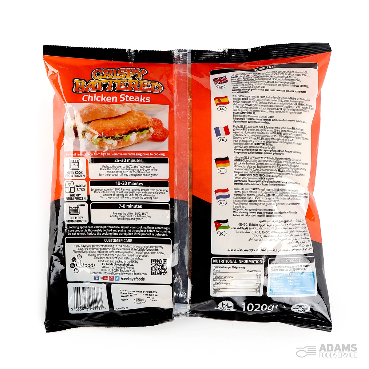 Chicken (53.5%), Water, WHEAT Flour, Maize Flour, WHEAT Semolina, Rapeseed Oil, WHEAT Gluten, Starch, Salt, Raising Agents (E450, E500), Rice Flour, Modified Starch, Dried onion, Dextrose, Yeast Extract (SULPHITE), Pepper, EGG Albumen, Monosodium Glutamate, Stabilisers (E451, E450), Acidity regulator (E500), Natural Flavouring, Sugar, Flavouring, CELERY, Anticaking Agent (E551)