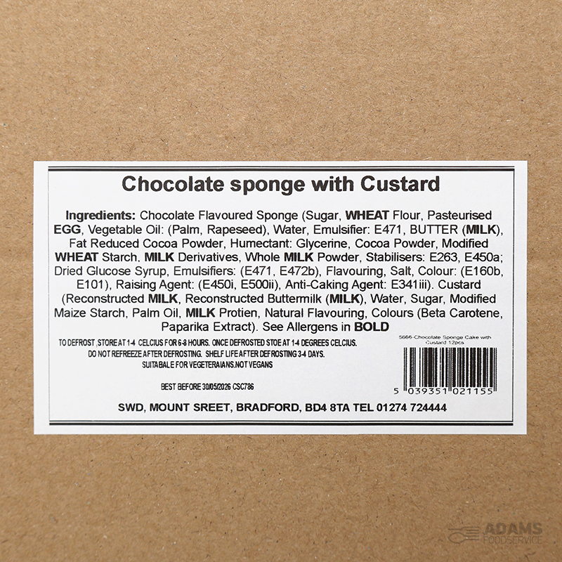 Chocolate Flavoured Sponge (Sugar, WHEAT Flour, Pasteurised EGG, Vegetable Oil: (Palm, Rapeseed), Water, Emulsifier: E471, BUTTER (MILK), Fat Reduced Cocoa Powder, Humectant: Glycerine, Cocoa Powder, Modified WHEAT Starch, MILK Derivatives, Whole MILK Powder, Stabilisers: E263, E450a; Dried Glucose Syrup, Emulsifiers: (E471, E472b), Flavouring, Salt, Colour: (E160b, E101), Raising Agent: (E450i, E500ii), Anti-Caking Agent: E341iii). Custard (Reconstructed MILK, Reconstructed Buttermilk (MILK), Water, Sugar, Modified Maize Starch, Palm Oil, MILK Protien, Natural Flavouring, Colours (Beta Carotene, Paparika Extract)