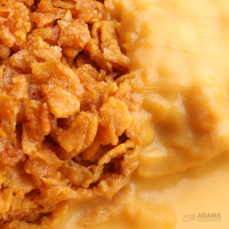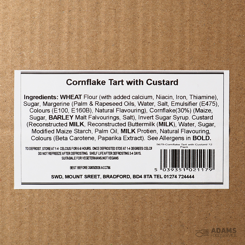 WHEAT Flour (with added calcium, Niacin, Iron, Thiamine), Sugar, Margerine (Palm & Rapeseed Oils, Water, Salt, Emulsifier (E475), Colours (E100, E160B), Natural Flavouring), Cornflake(30%) (Maize, Sugar, BARLEY Malt Falvourings, Salt), Invert Sugar Syrup. Custard (Reconstructed MILK, Reconstructed Buttermilk (MILK), Water, Sugar, Modified Maize Starch, Palm Oil, MILK Protien, Natural Flavouring, Colours (Beta Carotene, Paparika Extract). See