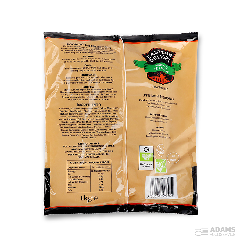 Meat Content 75% (57% Beef, 33% Chicken, 5% Mutton, 5% Lamb), Mechanically Separated Meat (Chicken), Beef Fat, Chicken Fat, Mutton Fat, Water, SOYA Protein, Rusk (WHEAT, Salt), Onions, Mixed Spices, Salt, Rapeseed Oil, Dextrose, Citrus Fibre, Flavour Enhancer (E621), Stabilisers (E450, E451, E452), Pepper Paste, Tomato Paste, Lemon Juice, Potato Starch.
