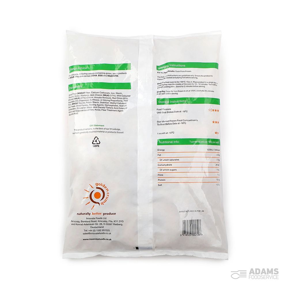 Wheat Flour (WHEAT Flour, Calcium Carbonate, Iron, Niacin, Thiamin), Water, Monterey Jack Cheese (MILK) (15%), Mild Coloured Cheddar (MILK) (15%) (Colour (Annatto)), Red Onion, SOYA Flour, Potato Starch, WHEAT Starch, Salt, Stabiliser (Methyl Cellulose), Raising Agents (Diphosphates, Sodium Carbonates), Yeast, Dried Parsley, Emulsifier (Mono and Diacetyl Tartaric Acid Esters of Mono- and Diglycerides of Fatty Acids), Flour Treatment Agent (Ascorbic Acid)