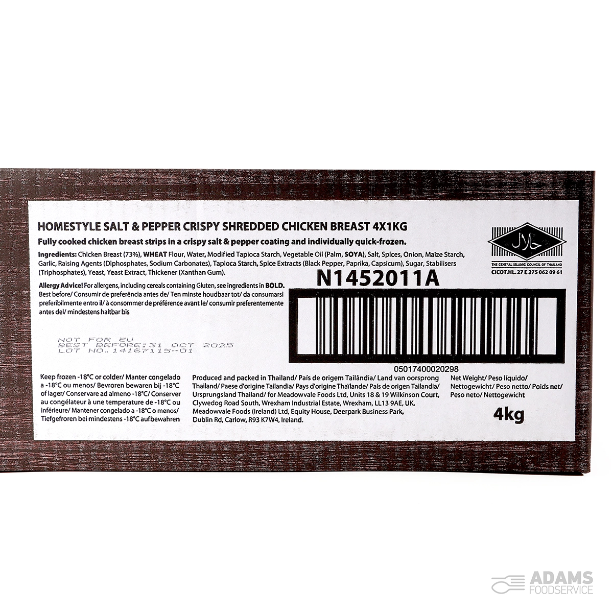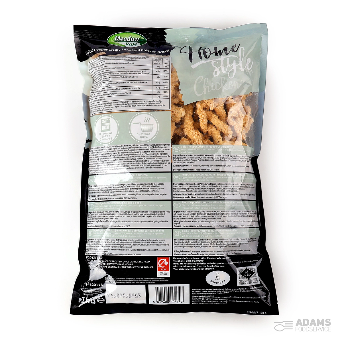 Chicken Breast (73%), WHEAT Flour, Water, Modified Tapioca Starch, Vegetable Oil (Palm, SOYA), Salt, Spices, Onion, Maize Starch, Garlic, Raising Agents (Diphosphate, Sodium Carbonates), Tapioca Starch, Spice Extracts (Black Pepper, Paprika, Capsicum), Sugar, Stabiliser (Triphosphates), Yeast, Yeast Extract, Thickener (Xanthan Gum)