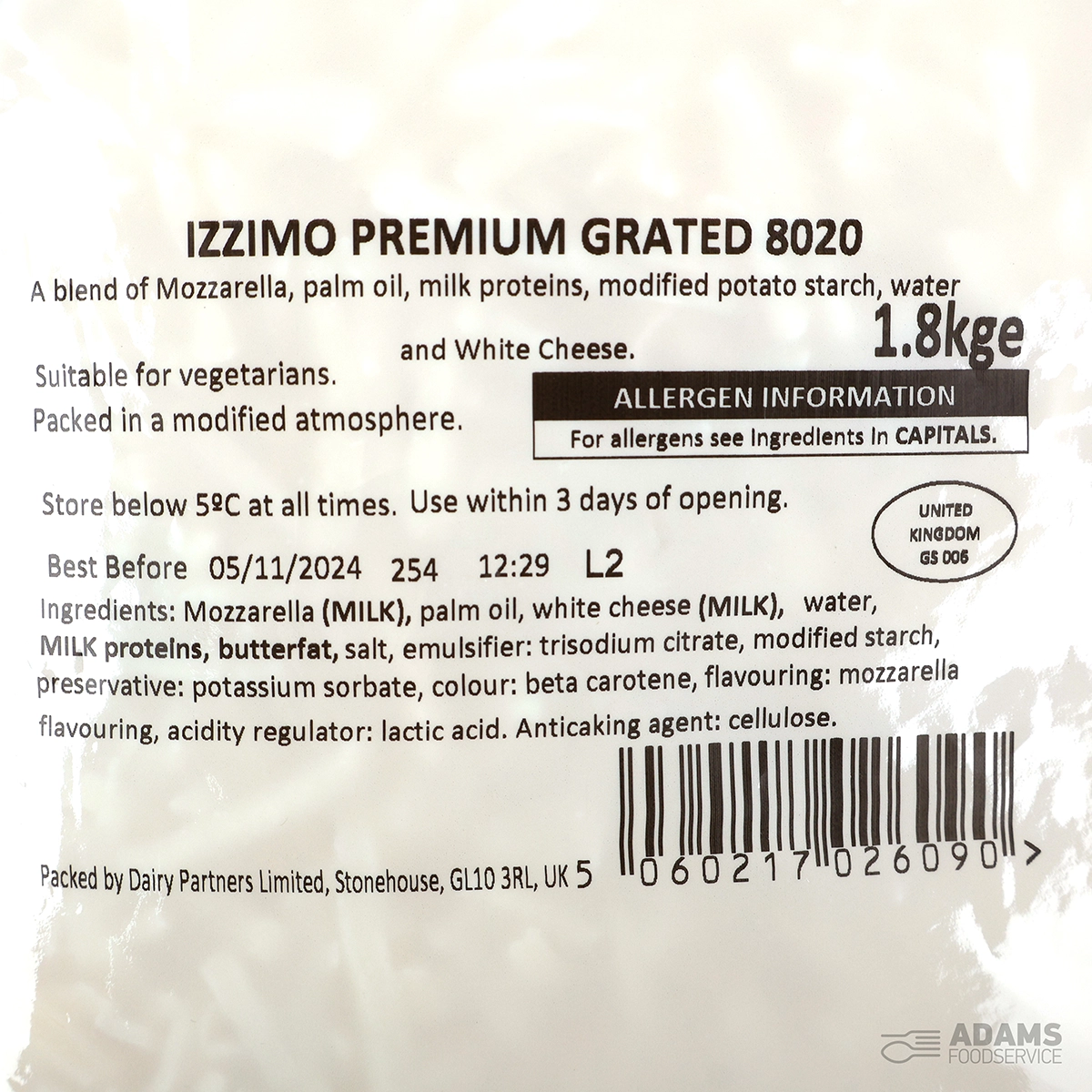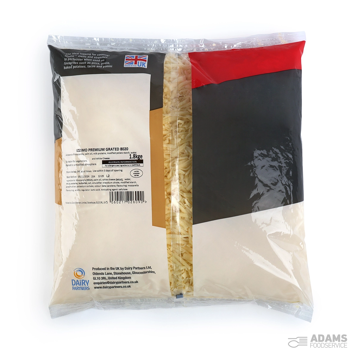 MOZZARELLA (MILK), palm oil, WHITE CHEESE (MILK), water, MILK PROTEINS, BUTTERFAT, modified starch, salt, emulsifier (trisodium citrate), acidity regulator (lactic acid), preservative (potassium sorbate), flavouring (mozzarella flavouring), colour (beta carotene). Anticaking agent (cellulose).