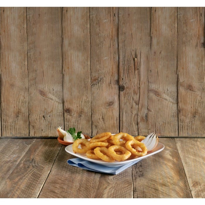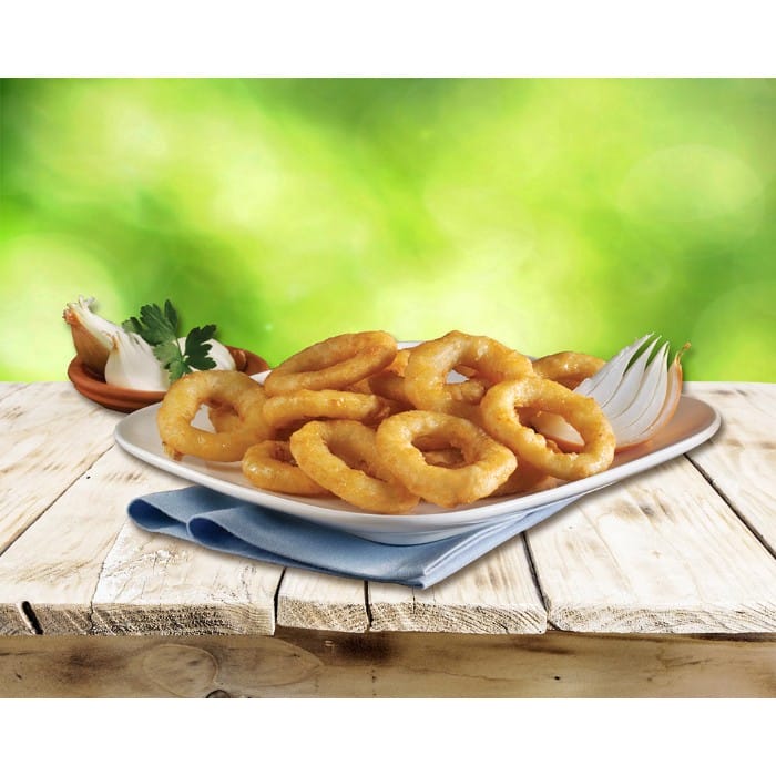 Formed Onion Rings made from small pieces of onion battered with a crispy bite.
