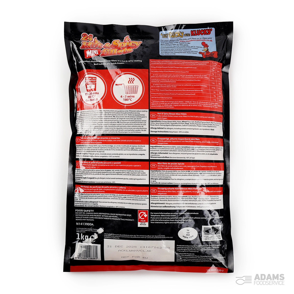 Chicken Breast (71%), Water, Breadcrumb (WHEAT Flour, Salt, Modified Tapioca Starch, Rice Flour, Chilli, Dehydrated Vegetables (Garlic, Onion), Spice Extract (Capsicum), Non-hydrogenated Palm Oil, Antioxidant (Sodium Citrate), Yeast Extract, Maize Starch, Raising Agents (Disodium Diphosphate, Sodium Carbonate), Pepper, Colour (Paprika Extract))