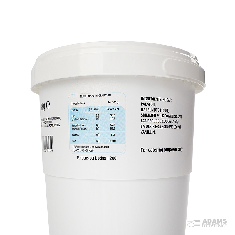 Sugar, palm oil, HAZELNUTS (13%), skimmed MILK powder (8.7%), fat reduced cocoa (7.4%), emulsifier (lecithins (SOYA)), vanillin