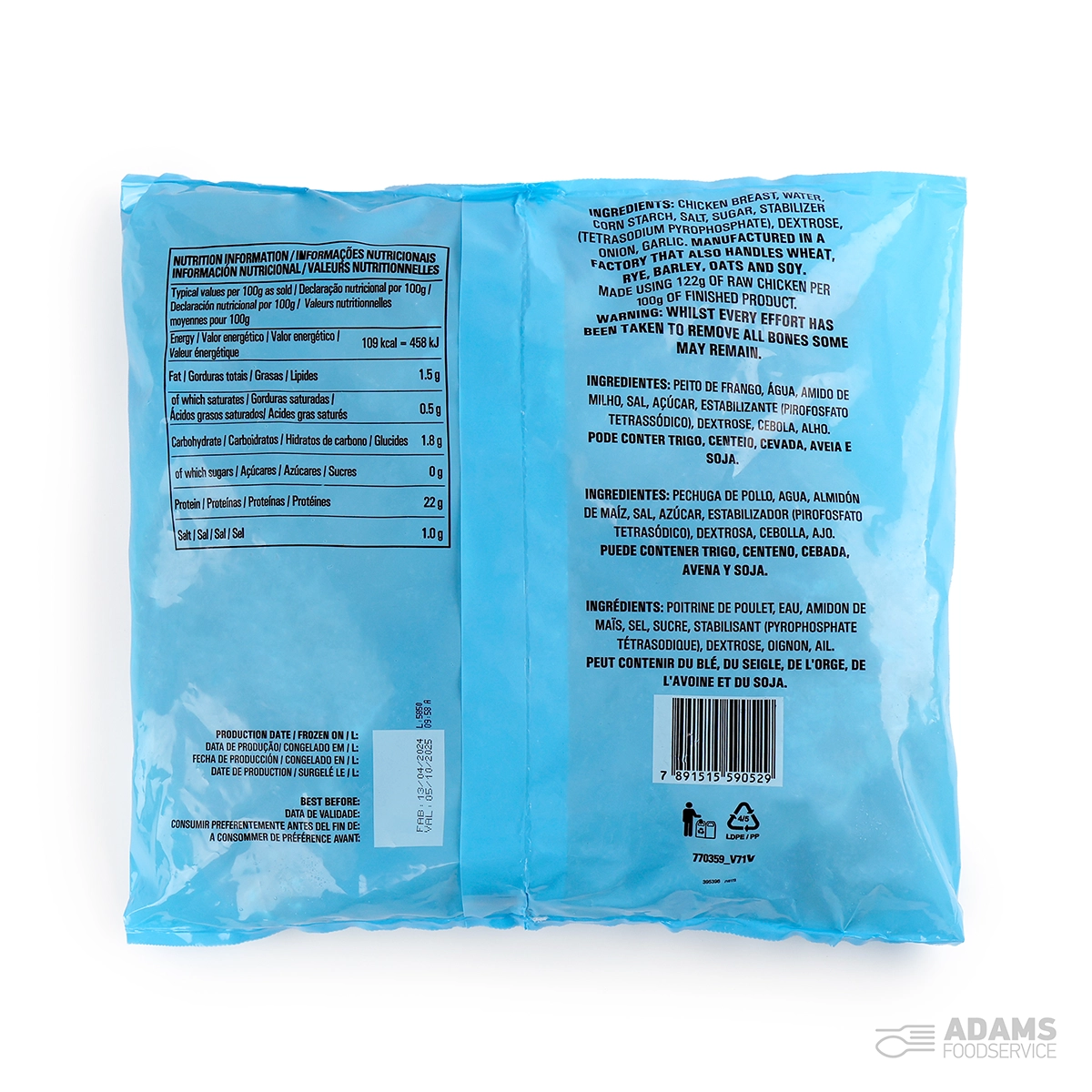 Chicken Breast, Water, Corn Starch, Salt, Sugar, Stabiliser (Tetrasodium Pyrophosphate), Dextrose, Onion, Garlic.