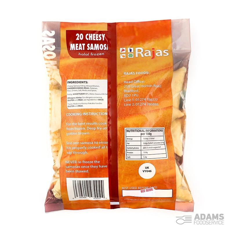 Filo pastry (GLUTEN), Minced Mutton, Cheddar Cheese (MILK), Potatoes, Onions, Peas, Garlic, Ginger, Green chillies, Yoghurt (MILK), Salt, Crushed chillies, Mehthi, Haldi