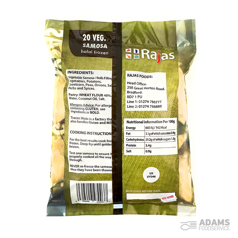 Filo pastry (GLUTEN), Mixed vegetables, Potatoes, Onions, Peas, Garlic, Ginger, Green chillies, Sweet corn, Salt, Crushed chillies, Mehthi, Haldi, Tomatoes, Veg Oil