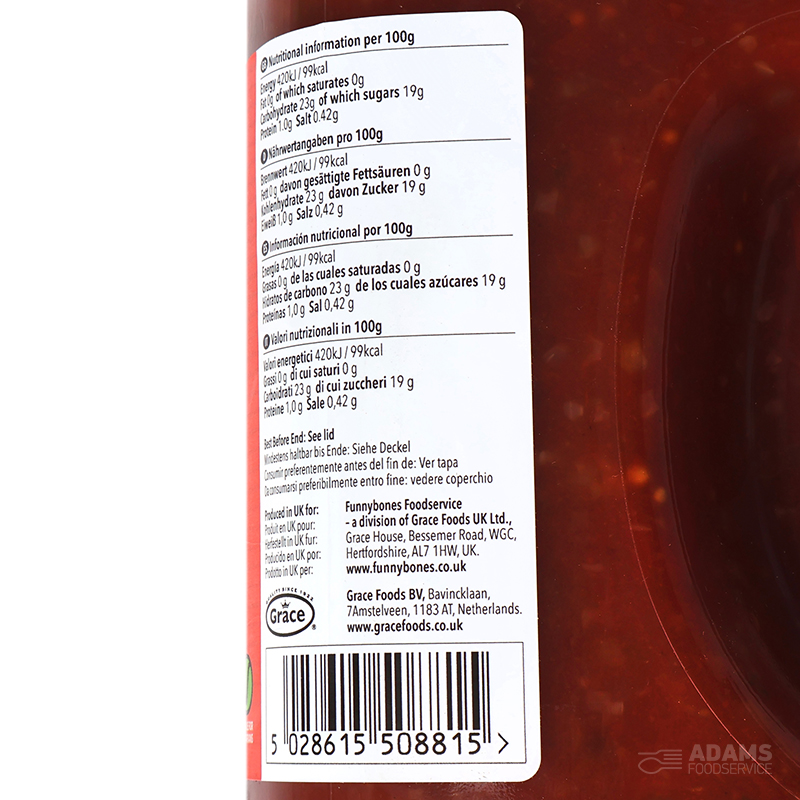 Water, Chopped Tomato, Sugar, Tomato Paste, Spirit Vinegar, Cauliflower, Gherkin, IQF Onion, Modified Maize Starch, IQF Red Peppers, Acetic Acid, Salt, Mustard Seeds, Ginger Powder, Paprika, Cinnamon, Clove