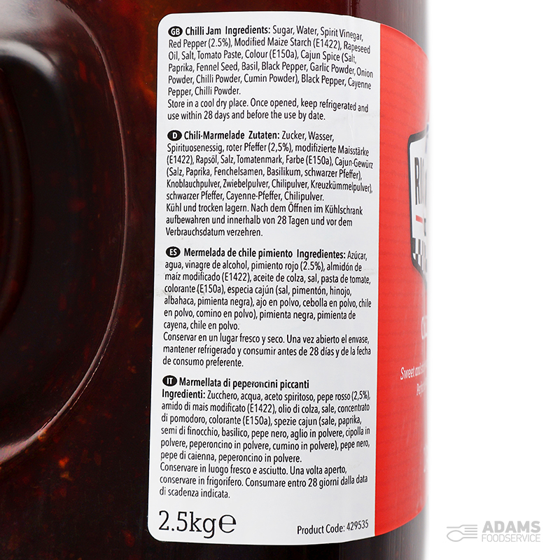Sugar, Water, Spirit Vinegar, Red Pepper, Modified Maize Starch, Rapeseed Oil, Salt, Tomato Paste, Caramel, Cajun Spice (Salt, Paprika, Fennel, Basil, Black Pepper, Garlic Powder, Onion Powder, Chilli Powder, Cumin Powder), Black Pepper, Cayenne Pepper, Chilli Powder